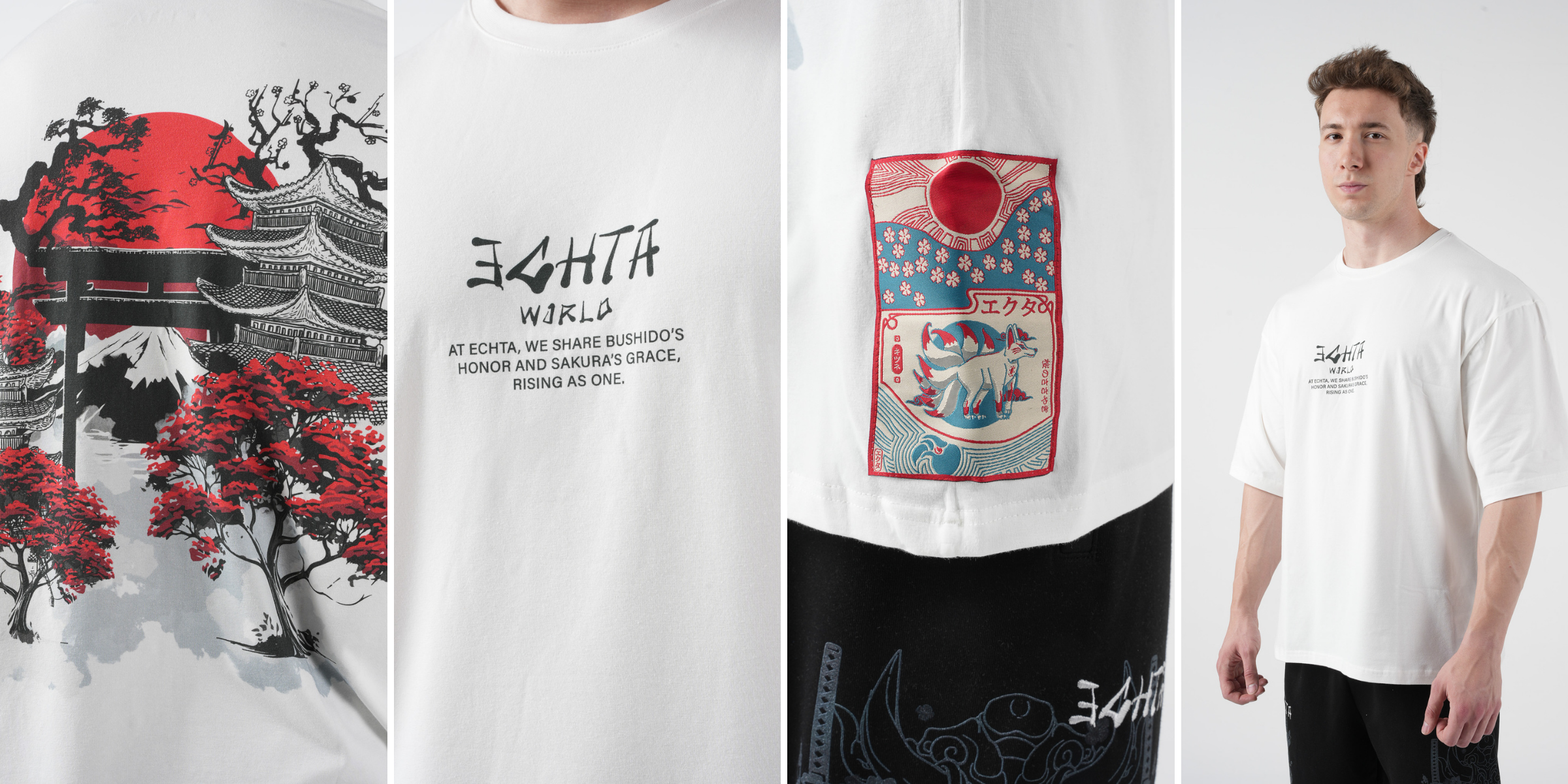 Sakura Gate Oversized T-Shirt, Japon kültürünün ikonik simgelerini taşıyan özel bir anlatıya sahip. Sırt kısmında yer alan Torii kapısı, tapınaklar ve kızıl yapraklı sakura ağaçları; hem mistik hem de estetik bir atmosfer yaratıyor. Arka fondaki Fuji silueti ve yükselen güneş, bu t-shirt'e metaforik bir doğuş enerjisi katıyor.